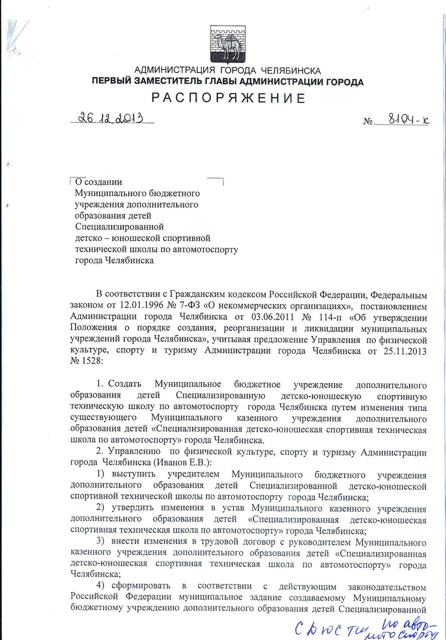 Устав МБУ ДО "СТШ по автомотоспорту" г. Челябинска (изменение № 7)